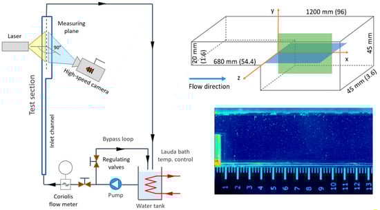 Left: Test loop configuration. Top-right: Schematic of the test-section, coordinate system and measurement planes z = 0 (green) and y = 0 (blue). In parentheses: dimensionless lengths. X-length of the measurement planes is around 25 cm. Bottom-right: raw image for PIV analysis in plane z = 0.