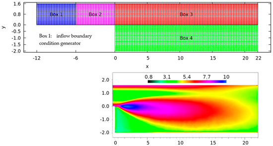 The computational domain in the DNS shown in Figure 2 is shorter than the one shown in Figure 1. A four-fold shorter inlet of 12 dimensionless units was applied and half of that inlet length was used to produce the fully developed turbulent inflow with the cyclic boundary condition. The inlet boundary condition ensured a constant mass flow rate through the domain. The outlet section in the computation was shorter too (22 dimensionless units); however, it was long enough to eliminate the influence of the outflow boundary condition on the recirculation vortex behind the step.
