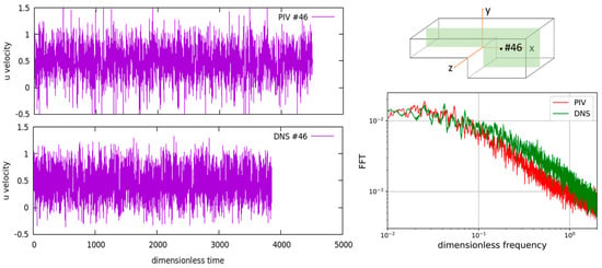 Figure 3 shows time histories of the streamwise velocity in a point at similar location in the PIV experiment and in the DNS. The point number #46 corresponds to the location #46 used in the uncertainty analysis of the DNS results performed by Oder et al. [32]. This analysis was based on time histories recorded in 50 points in the computational domain. The exact locations of the point #46 is slightly different in the experiment and DNS in order to get the data from a single spatial point without any spatial interpolation. Nevertheless, neighboring points in the experiment and DNS show similar qualitative behavior in the region, where turbulent kinetic energy of the flow is near its maximum.