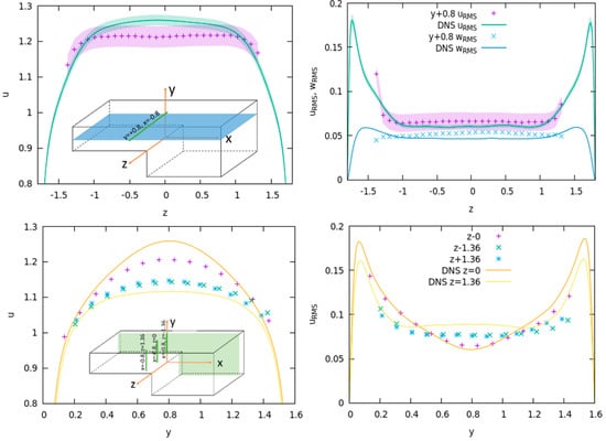In Figure 8, better agreement of both measurements and DNS is observed for the first-order statistics, i.e., mean velocity components, and just slightly worse in the second-order statistics (velocity RMS fluctuations and Reynolds stress tensor component).