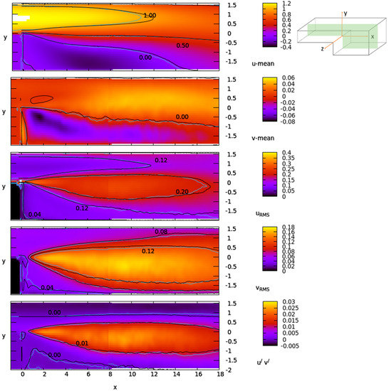 Time-averaged velocity field of case ‘z − 0’: components u and v (top pair), uRMS,vRMS, u’v’ (bottom triplet) in plane z = 0. PIV experiment: color-scale and blue contours. DNS—black contours.