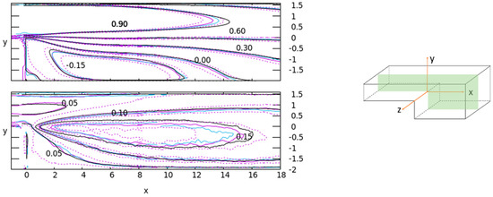 The streamwise velocity field shown in Figure 5 shows the expected agreement of the measurements and the black simulation contours. A small vortex can be seen in the bottom left corner (x = 0 and y~−2) just downstream the step and is visible in both mean velocity components in Figure 5. The large vortex that spans down to the dimensionless length of x~15 (~20 cm behind the step) is clearly visible in the top image of Figure 5. Reattachment point at z = 0 is defined by the point where the contour 0.0 of u velocity touches the y = −2 plane. Due to the 3D nature of the flow, the reattachment point is actually not a point but a curve on the plane y = −2. The shape of the reattachment curve can be obtained from the measurements from the different perspective (y = const. planes), and is discussed in the next subsection. Several authors [1,18,19,20] reported that the size of the separation zone in separated flow depends not only on step height but also on the degree of turbulence in the upstream flow. In fact, it has been shown that the length of the separation region decreases with the increasing degree of turbulence in the upstream flow. In particular, Isomoto and Honami [19] measured the influence of turbulence on the length of the separation region behind the step with height of 40 mm at Reynolds number of 32,000. Our obtained reattachment point at the symmetry plane (i.e., plane z = 0) is 7.5 step heights downstream the step and it corresponds to the turbulence intensity of the inlet flow of about 4%. In general, the length of the separation region behind the step depends on the degree of expansion and asymmetry of the channel, and it varies from 6 to 9 calibers of the step height [1].