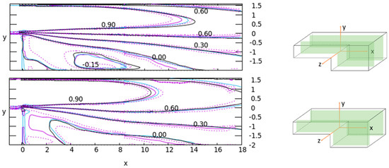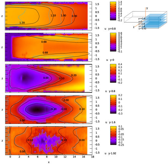 Results of the measurements in planes y = const. are shown in Figure 9 and Figure 10. Complete fields of streamwise velocity component u are shown in Figure 9, although, as already mentioned, the results in the near-wall regions of around 0.4 dimensionless units on each side should be ignored. Thus, the color fields and contours of the measurements at z > 1.4 and z < −1.4 should be disregarded in Figure 9. The profiles shown in Figure 10 have this part of the measurements already removed.