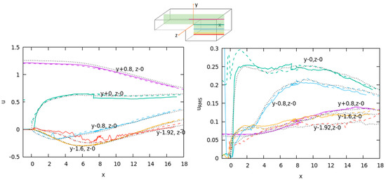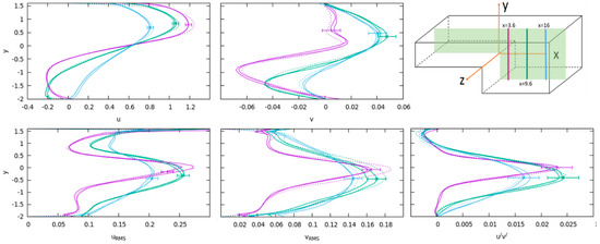Position of the line segments, where the profiles are plotted, is shown in the top-right sketch of Figure 10. Similar graphs with similar agreement can be obtained from the database at other y = const. planes, except the plane y = −1.92, where the accuracy of the measurements is deteriorated. Seemingly, larger differences are observed in the profiles of the w direction mean velocity; however, one should notice that the magnitudes of this velocity are very low: just around 1% of the mean flow velocity u and almost 10 times lower than the magnitude of the v velocity component shown in Figure 8. Agreement of the velocity RMS fluctuations is similar as the one observed in measurements in z = const. planes in Figure 8 and the agreement of the Reynolds stress component u′w′ is slightly worse than the one observed in Figure 8 for the component u′v′.