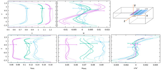Measurement ‘y + 0.8’, profiles at x = 3.2, 9.6, 16. Variables: u, w, uRMS, wRMS, and u′w′. Solid lines: original measurements and measurements mirrored over z = 0. DNS—dotted lines. Uncertainties are given in a single point per profile.