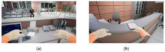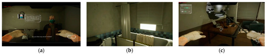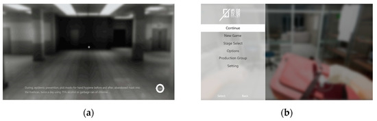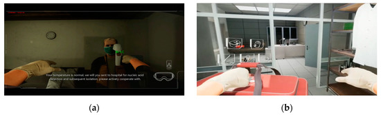 Figure 6 displays the gaming UI. Figure 6a shows the user measures the close contact’s temperature by wearing the complete protective equipment. The mask and eye protection icon display on the right bottom side. When the user takes off the equipment, the icons will disappear and warn the user. Figure 6b displays the tool icon. When the user takes the medical package, the medical tool icons appear on the left side to let the user check the tool list and select the correct tool to use or wear. The icons list with a slight angle rotation to generate the depth perspective. Besides the UI icon indication, the system uses the 3D object in the scene to indicate the user to move the target position (Figure 6b). Both 2D and 3D UI can assist the user to avoid lost in the VE and guide them to complete the tasks.