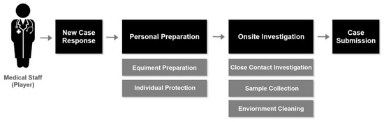 Figure 2 displays the system’s storyline. The research designs the user to play as the medical staff. The user will go through the COVID-19 infection protection procedure. The figure illustrates the several steps include new case response, personal preparation, onsite investigation and case submission. New case response section assists the user in knowing about the COVID-19 case information. The personal preparation section contains equipment preparation and individual protection. Both procedures can help the user to understand the isolation for preventing transmission of COVID-19. For instance, the user can learn how important to wear eye and face protection in COVID-19 outbreak. Onsite investigation section allows the user to investigate and test the close contact, environment cleaning and environmental sample collection. The final section is the animation to show how the case submit to the Centers for Disease Control and Prevention (CDC). The overall storyline covers the knowledge of the infection protection field. The plot-based storyline can let the user explore medical knowledge with interactive experiences. In the following section, the article displays the system details.