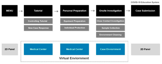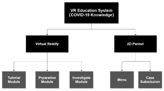 This section focuses on the main modules of the system which scene is in the VE. The main modules are the essential section to use VR technology to convey the COVID-19 knowledge to the user. The main modules of this system can be divided into the Tutorial Module, Preparation Module and Investigation Module. The details of the main modules are shown in Figure 7.