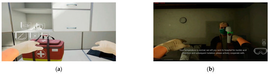 The system provides various interaction methodologies. Figure 4 illustrates the primary interactive samples. Figure 4a displays how to interact with the medical package [9]. At first, the system allows the user to pick up the medical tools by VR controller first trigger. The users can press the controller Button One to turn on the selected tool [9]. Figure 4b shows how to use a thermometer to measure the close contact’s temperature. When the right hand controlling aims the thermometer to the head of the close contact and clicks the right-hand trigger button, the user can successfully measure the body temperature and start the storyline conversation to the contact.