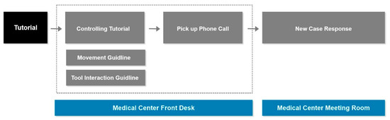 In order the assist the user in understanding the movement and interaction in the system, it is necessary to build the tutorial module as the first VR module in the system. The module has three sections: Controlling Tutorial, Pick up Phone Call and New Case Response. The controlling tutorial is at the front desk in the medical center. Furthermore, the research uses the plot-based methodology to guide the user to move to the next section. Notifying to pick up the front desk phone call, it moves to the new case response section. It provides the story background to help the user enter into the storyline as an active participant. Figure 8 displays the exploring flow of the tutorial module.