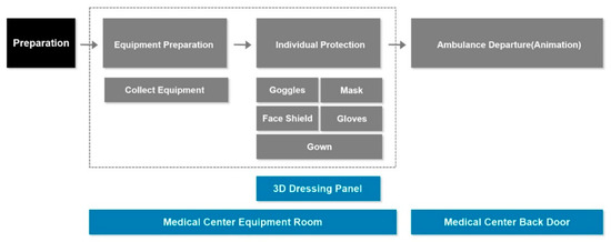 Compared to the tutorial module, the preparation module has more interactive elements. Figure 11a shows how to collect the related materials in the equipment room. The research uses the highlight color to simplify the collecting process. When the user enters the equipment room, the system indicates the user to interact with the medical package. The system notifies the user to collect the suitable material from the warehouse to the medical package. The system highlights the tools to help the user to find. Besides, the 3D wearing section refers to the game character dressing. After completing the collection, the system indicates to start the individual protection section. Figure 11a shows the 3D wearing panel. The user needs to move the equipment to the correct corresponding position. After the section completed, the equipment room door opens and the user can move to the back door to trigger the storyline. Both two sections use interactive game methods to improve the user experience.