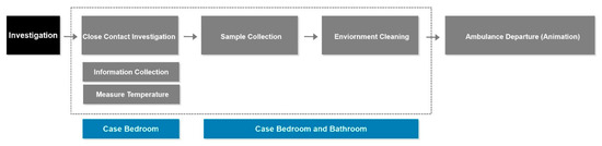 Investigation Module Implementation: (a) Close Contact Investigation [9]; (b) Sample Collection in bathroom [9]; (c) Environment Cleaning [9].