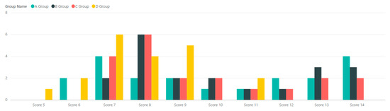 The research collects the user score in four groups from questionnaire data. Figure 15 displays the user score distribution in each group. The research runs the one-way MANOVA (Multivariate Analysis of Variance) in Excel software to analyze the difference between each group’s score (Table 4). The p-values data is shown as follows: