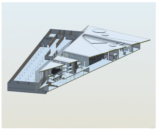 Models should be developed following the relevant LOD and LOI, jointly approved by the designer and developer, and only initially proposed by the developer (as mentioned earlier, certain elements do not need to be presented in high geometric detail for the information required by the developer, contractor or facility manager), at a date specified in the schedule and in the correct format. Two-dimensional data should be generated from models. The design should ensure that components feature sufficiently detailed information to allow for generating schedules relevant to the developer. Models should be divided by specialization; namely, apart from the architectural (the architectural BIM model for the LPSC is presented in Figure 3) and structural model, there should also be models for low-voltage utilities, fire safety, the compressed air systems and a central building management system (BMS) coupled with an energy management system (EMS). The EIR for the KMC also stipulated the development of an acoustic model.
