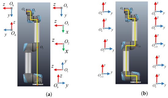 In this article, the initial parameters and installation positions of these motors are similar to the typical UR5 robot. To simplify the control of the UR arm, researchers have developed a classical kinematic modeling result based on the Standard Denavit–Hartenberg (SDH) method [41]. Therefore, the kinematic modeling of the manipulator subsystem based on the classical method is shown in Figure 2a. In the classical method, motor 2, link 2 and motor 3 are regarded as a complete connecting link. With the comparison between the actual physical model and the mathematical model, we found that (1) the huge difference between the position of the second joint and the location of the actual motor cannot be ignored, and it can also be seen in the third joint; (2) the position of the connecting link between the second joint and the third joint acquired by the classical method is unable to match the actual position.