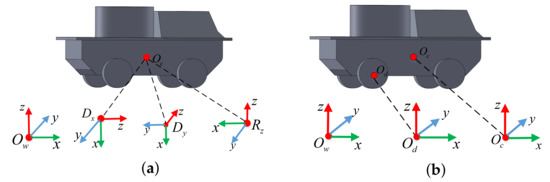 - The body-fixed frame . The origin of the body-fixed frame is attached to the center of the mobile platform, and the direction of each axis is defined according to the motion requirements. It is used to describe the position and posture of the mobile platform.