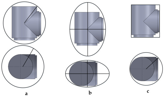 Approximating the components is the first key step in self-collision detection, which mainly simplifies the description of the robot to make the component more suitable for self-collision detection than the actual physical structure. However, the objects used by researchers to approximate the structure shapes of various components mainly include the spherical element, the cylindrical element, and the elliptical element. When approximating the components of the robot, the standard approximate element needs to meet the following basic conditions: for the spherical element, the sphere’s radius is regarded as the largest value to ensure that it surrounds the outer boundary of each component; for the cylindrical element, the length of the cylinder is equal to the maximum distance in the three directions, and the radius of the cylinder can envelop the lateral boundary of each component; finally, for the elliptical element, the longest axis of the ellipse needs to envelop the longest endpoint of the component, in addition to the shortest axis also being required to envelop the shortest cross-sectional length of the component, and the length of the other axis is selected as the minimum distance. The approximate results of the same components utilizing different approximate elements are shown in Figure 4. The basic conditions can completely distinguish the possible collisions between the surface points of different components.