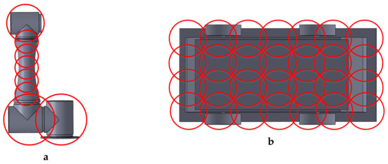 One spherical element cannot simplify all components of the mobile manipulator robot, and we should simplify the special parts by using multiple sphere elements. In the mobile manipulator robot, self-collision detection requires different approximations of various components, including the mobile platform subsystem, the manipulator subsystem, and the carrying load. The mobile platform has a complete and closed structural feature, and the motors of the manipulator subsystem were also designed with a complete and closed structural feature. However, the connecting link between the adjacent joints of the manipulator subsystem are designed according to the actual requirements and appearance beautification. To quickly establish the approximation of the entire system for collision detection, each component needs to be rapidly approximated by selecting a simplified approximate object. For these motors in the manipulator subsystem, we can directly select a single sphere element to approximate, which can be seen in Figure 4a. However, some components cannot be directly regarded as a single spherical object, such as the connecting link and the mobile platform. In this case, we should select multiple sphere elements to describe the component in order to achieve a specific structure shape, which is shown in Figure 5.