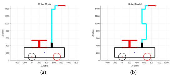 For the mobile manipulator robot in Figure 1, the manipulator subsystem is composed of two links and six motors. To establish a mathematical model, the subsystem can be simplified to six joints and seven links according to the standard Denavit–Hartenberg (SDH) method. Then, the position and posture of the end tool of the manipulator subsystem can be solved by the homogeneous matrix transformation between adjacent coordinate frames. Assuming the mobile platform moves on the horizontal plane, since the mobile platform is driving by the rear wheels, the position and posture of the midpoint of the driving wheels can be solved by the movement along the x-axis and y-axis and the rotation around the z-axis of the world frame. Therefore, the control variables of the entire mobile robotic arm system can be specifically expressed as