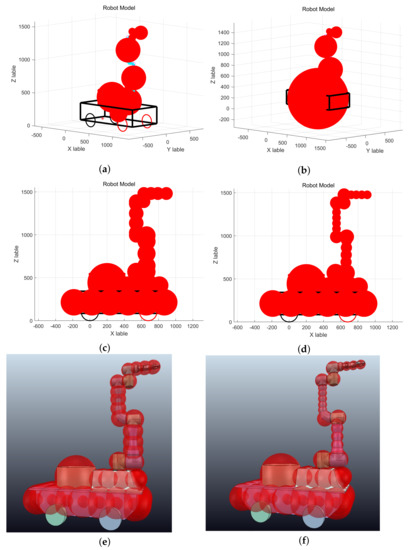 Currently, spherical elements are commonly selected to approximate each component. This is because other elements have many defects in approximating some components of the mobile manipulator robot. For example: first, collision detection is impossible to be determined by using the cylindrical element to approximate each component of the entire system, which is caused by different types of collisions in different positions of two cylindrical objects, including the arc surfaces of two cylindrical objects, the horizontal surface of two cylindrical objects, and the horizontal surface of one cylindrical object and the arc surface of another cylindrical object; second, collision deletion cannot be quickly determined using elliptical elements to describe each component, as the collisions of two elliptical objects can only be determined by the shortest distance between two surface points; third, collision detection of two spherical objects can be determined by the shortest distance between two surface points as well as by the shortest distance from the center of the radius of one sphere to that of another. Therefore, to accurately describe the various components and quickly determine the real-time self-collision detection, spherical elements were used to pre-process the self-collision detection of the mobile manipulator robot. As such, various suitable spherical objects were selected for the approximation of each component.