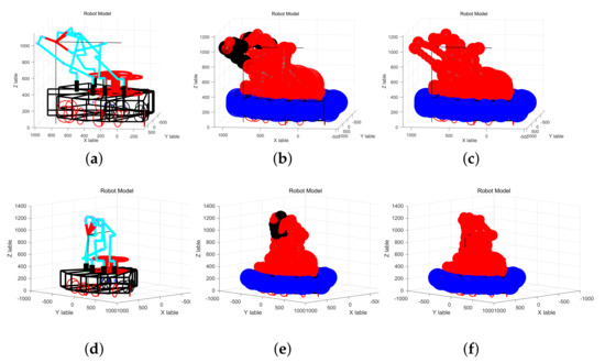 Inverse kinematics analysis of the mobile manipulator robot. (a) Solution results for desired position 1; (b) Collision detection results based on the typical method for position 1; (c) Collision detection results based on the improved method for position 1; (d) Solution results for desired position 2; (e) Collision detection results based on the typical method for position 2; (f) Collision detection results based on the improved method for position 2.
