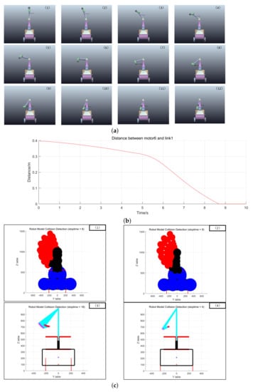 (3) Before reaching the inappropriate angle in Figure 9c, Figure 10c and Figure 11c, the manipulator subsystem will inevitably not collide with other components. If shorting the time interval of system movement, we can redefine the angular where the system collides due to the influence of the motion accuracy. However, this result only improves the angle accuracy before self-collision detection.
