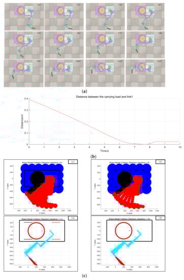Figure 10 shows the result of the movement of the mobile manipulator and the change of the shortest distance of the collision components in situation 2. In the simulation of VREP software, the manipulator subsystem reaches the designated position smoothly according to Figure 10a. However, the shortest distance of the manipulator subsystem and the carrying load is becoming to zero between s, the corresponding joint angle is (26°, 90°, 0°, −90°, 0°, 0°), and the robot’s motion results are shown in Figure 10a,b. When using the basic method and the improved method to detect the self-collision of the mobile manipulator, the larger step size can detect the collision of two components at s and s. When a smaller step size is used, the typical method will detect the collision at s, and the joint angle at this moment is (40.05°, 90°, 0°, −90°, 0°, 0°); the method in this paper will detect the collision at s, and the corresponding joint angle is (38.25°, 90°, 0°, −90°, 0°, 0°). In the second simulation with the VREP software, the manipulator subsystem can move close to the edge of the carrying load without collision. However, we use the spherical element to approximate the manipulator subsystem and the carrying load for practical applications, the typical method and the improved method will be judged as a collision occurs before the manipulator subsystem touches the edge of the carrying load. Therefore, the results of the self-collision detection based on the two methods are quite different from the actual collision joint angle.