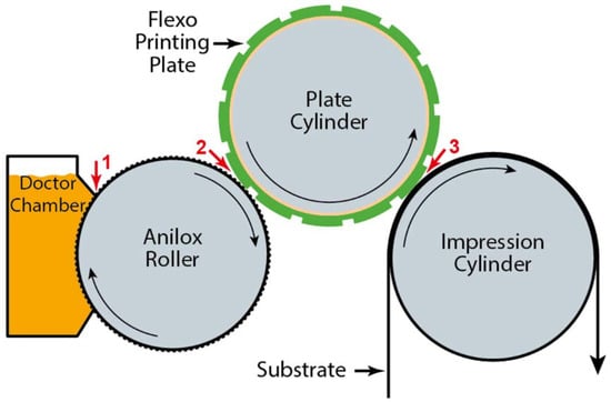 Pressure in printing is a parameter that significantly affects ink transfer, and that will also be a subject of research in this paper. The printing pressure can be adjusted at three points: (1) between the doctor blade and the anilox roller, (2) between the anilox roller and the printing plate and (3) between the printing plate and the printing cylinder (Figure 2). A change in the pressure between the printing plate and the printing cylinder has the greatest impact on the tonal value increase and thus on the print quality [21].