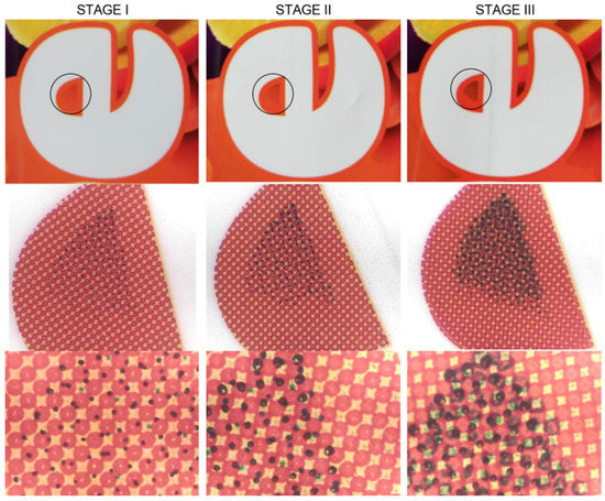 Dot deformation caused by a worn polymer plate surface can indirectly be researched by measuring the dot diameter or percentage of the coverage of the dots on the prints at the third stage of printing. Dot deformation in the printing process due to wear of the photopolymer printing plates is a very common occurrence. Because of the soft and flexible material, the wear effect is much more pronounced in large print runs. Due to the wear of the tops of the dots, their shape changes, and the tonal value increases. Figure 3 shows three samples captured in the same area of the print through three stages of printing. The first sample is a view of the dots on the first good print obtained with new printing plates (Stage I). The second sample was obtained after a print run of 100,000 labels (Stage II), and the third sample was from after a print run of 500,000 labels (Stage III). The entire print run was printed under the same conditions of the printing process, which included the settings of the printing machine, anilox rollers, pressure during printing and printing plates. Images for evaluation were captured on one characteristic area of the printed label where the deformation was most visible so that the results of the analysis of the individual stages could be compared with each other.
