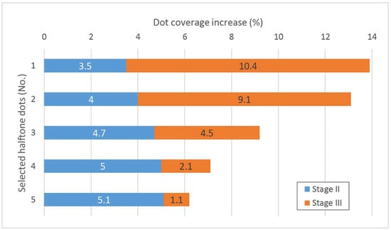Absolute increase of dot coverage values for five selected halftone dots at Stage II and Stage III.
