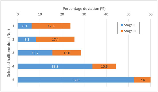 Relative percentage deviation for five selected halftone dots at Stage II and Stage III.