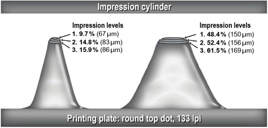 Research of the influence of the printing pressure has shown that the percentage of ink transfer increases with an increase in the printing pressure [22], and once the ink transfer reaches its maximum, there is no further increase in ink transfer regardless of a further increase in the printing pressure [23]. Light (also known as kiss) pressure is very important for quality reproduction because it prevents the “halo” effect and optimizes the tonal value increase (TVI). Light pressure is the lowest possible pressure at which the ink is transferred from all printing surfaces to the printing substrate [24]. Very often, it is not easy to print with light pressure, primarily due to the characteristics of the surface of the printing substrate, the uneven height of the printing elements or the type of work that is to be printed (e.g., solid tone printing, combined printing or process printing). On the other hand, if the pressure is too high (nip engagement > 150 µm), the dots will be squeezed more, and deformities can occur [25]. The surface of the plate will be outside the print diameter, so a slurring effect will occur at the places of contact between the plate and the printing substrate due to the faster circumferential speed of the plate surface. Otherwise, if the compression is too low (nip engagement < 20 µm), slurring also occurs due to the lower circumferential speed of the plate surface. There are many potential parameters from the domain of prepress and printing that affect the deformation of dots directly or indirectly. The prepress parameters are related to the settings of the halftone screening, specifications of polymer plate, geometry of the plate dot and type of plate surface pattern. The printing parameters are related to the printing pressure settings, type of substrate, print run size, printing speed, anilox roller specification and also mounting adhesive tape specifications.