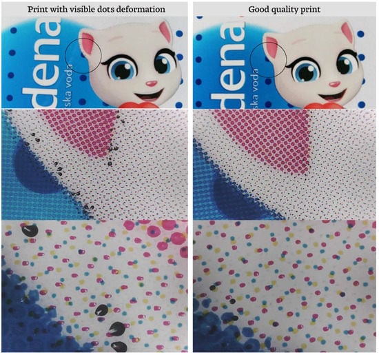 Furthermore, the characteristics of the printing process should be compared with the values from Table 3. It was noticed that only the line screen of the anilox roller for the black color was too low, while other anilox rollers were in accordance with the specifications. According to the data listed in Table 3, the anilox roller line screen for the black color of 340 cells/cm (860 cpi) was sufficient for quality reproduction of the minimum dot of 2% coverage. A dot of 1% coverage at 133 lpi (22 μm) was smaller than the anilox cell opening at 340 c/cm (26 μm). The dot was dipped in the cell and too much ink was transferred onto the printing substrate. In addition, with the top of the dot, the ink was also transferred with the side parts of the dot (dot shoulders), thus creating very pronounced black spots on the print in the highlight tones (Figure 9, left). The quality of the reproduction was significantly reduced and unacceptable, which was visible in the form of a darker halo around the dot. By applying an adequate anilox roller line screen, the printing error could be corrected very quickly, as shown in Figure 9 on the right.