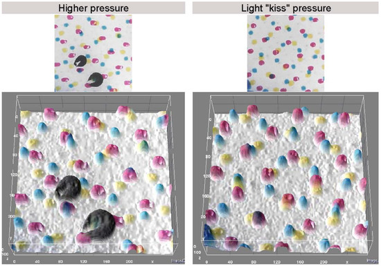 Dot formation on a printing substrate depending on the printing pressure can be best seen from topographic views produced on the basis of microscopic images by using the “Interactive 3D Surface Plot” tool from the ImageJ software for image analysis. Topographic views show the absolute color density that is directly related to the thickness of the ink film and the characteristics of the printing substrate. The color density projection, performed with the help of the proportional height of the element in the 3D view, clearly shows the inhomogeneity of the dots due to the excessive printing pressure (Figure 11, down left).