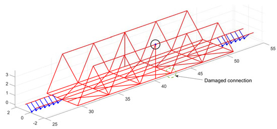 The first damage considered represents a degradation of the connection between a diagonal member and the lower chord. The structural components involved in the damage are highlighted with the dashed green circle shown in Figure 2. In case of total damage, the lateral element does not contribute to the global stiffness matrix of the bridge, since it does not transmit any axial action, but its mass still remains in the model, sustained by the upper connection. This damage can then be modelled by removing the diagonal element from the finite element model of the bridge, and by applying a concentrated inertia at the connection of the removed element with the upper chord (indicated with the black circled marker in Figure 2).