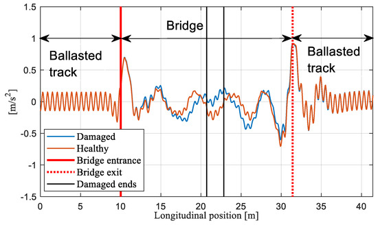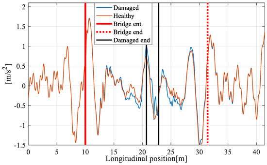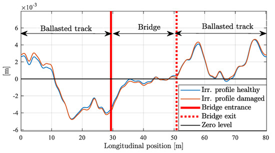 Two slightly different track profiles are adopted for the case of healthy and damaged bridge to account for a degradation occurring on the same track in a certain period of time. An example of the difference in track irregularity degradation adopted is reported in Figure 4: two different profiles can be observed, one exploited for the damaged bridge and one for the healthy bridge assumed as a reference.
