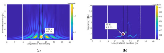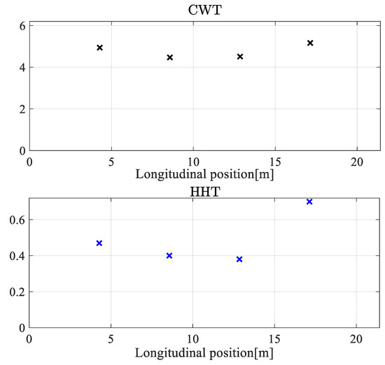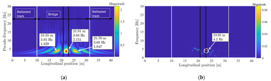 Figure 10 reports the results obtained through the CWT (Figure 10a) and the HHT (Figure 10b). Again, the actual damage positions are correctly identified by the CWT and the HHT (the peak falls at the left margin of the damaged region), with damage-related frequencies (i.e., 3.68 Hz and 4.5 Hz, respectively) similar to those observed in Figure 9 without track irregularity. It can be therefore inferred that these appear to be related to the signature of the defect affecting the structure. As in the results of Figure 9, the HHT performs less precisely in locating the defect.