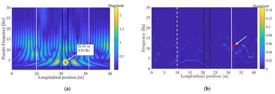 Figure 8a reports the position–frequency map of the difference of the CWT coefficients of the damaged and healthy condition, while the results of the HHT are reported in Figure 8b. In both the cases, the maxima of the index revealing the presence of the damage can identify the damaged region, although the HHT instantaneous energy peak falls at the right margin of the affected region.