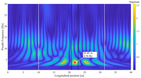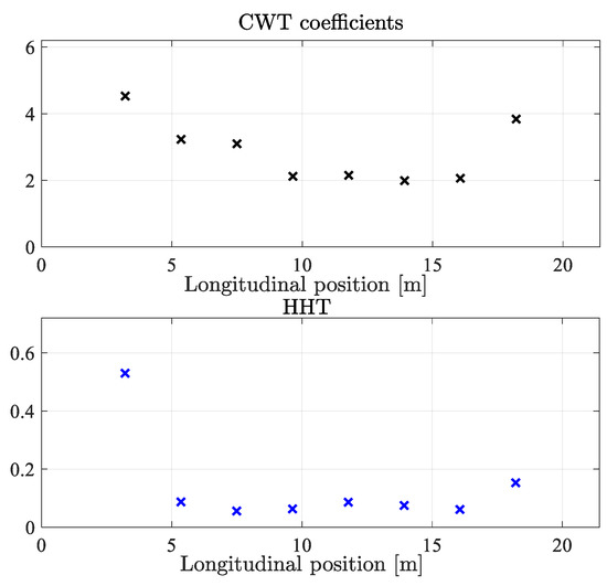 The 9 Hz frequency peak is indeed also found in the CWT when the defect affects the last module, but in this case the dominant peak is the one at low frequency, which is therefore represented in Figure 13 (at the x-axis position of about 18 m): again, the secondary peaks (in terms of magnitudes) are represented with thinner circles.
