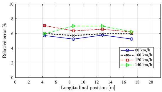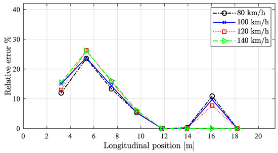 As for the train’s speed influence, Figure 16 reports the values of the relative identification error as a function of the position of the defect along the bridge span. The reported results, referring to the CWT algorithm, correspond to simulation cases in which a different track irregularity was adopted in the simulations of the damaged and healthy bridge.