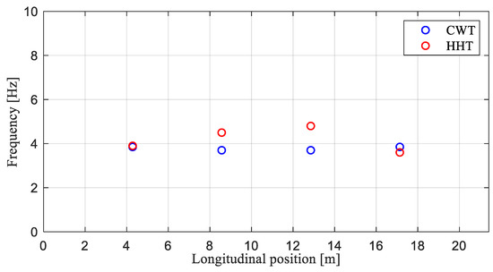 Figure 17 illustrates the trend identified by the CWT and HHT algorithms in terms of damage-related frequency. The results refer to the CSA train travelling at 100 km/h, in the absence of track irregularity. Again, it is possible to state that the two time-frequency methods led to similar results in terms of frequency identification. The damage-related frequency is similar to the one identified for the previous kind of defect (Figure 13), meaning that the zones of influence of the two defects are rather similar. Moreover, the effect of the bridge damage on the first bending mode of vibration occurring at 16 Hz, is not large enough to be detected by the passing train.