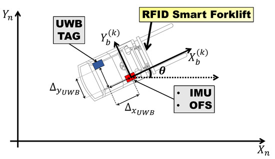We define at each timestep k a body reference frame where is the origin of the reference frame, which is centered on the IMU/OFS location, whereas , , and are the local x-, y- and z-axes at timestep k, respectively. The IMU and the OFS sensor reference frames are considered oriented as the forklift body frame. The local forklift reference frame and the plant/warehouse reference frame are then linked by a rigid roto-translational transformation, which depends on the location and orientation of the forklift at each timestep k, as described in Figure 1, where corresponds with , and is the angle between and . The UWB tag has a constant displacement in the body frame, with respect to , which can be defined as . This offset must be translated in the plant/warehouse frame according to the estimated orientation .