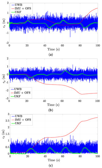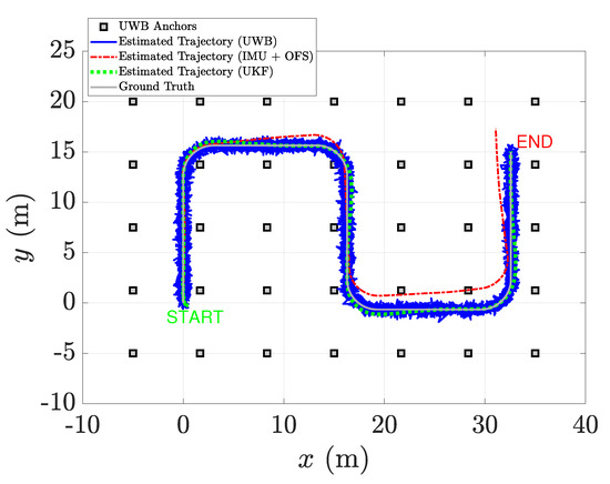 A top view of the performed simulated trajectory is depicted in Figure 3. The UWB anchors are the gray squared markers, and the ground truth trajectory is depicted as a continuous gray line. We represent, with a continuous blue line, the trajectory estimated with the UWB system only. The output of the dead-reckoning process by using only IMU and OFS is instead depicted as a dashed red line, whereas the output of the proposed UKF-based algorithm is the pointed green line.