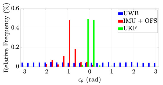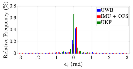 Figure 16 shows the cumulative distribution function of the distance error for the different tracking methods (UWB, IMU + OFS, UKF) by considering all the test cases I–IX. As it can be noticed, the error of the UKF is bound to 4 m, which is acceptable for a tracking method in an industrial scenario of 4560 m2 by also considering the forklift sizes. The forklift orientation, indeed, is better reconstructed with the UKF as shown in the histogram in Figure 17. In particular the global mean orientation errors are rad, rad, and rad, whereas the standard deviations are rad, rad, and rad. Accordingly to what was observed in the simulated analysis, the UWB system with a single tag is still not able to correctly retrieve the forklift orientation, but it has a better behavior with respect to the simulated analysis. This effect is obtained thanks the data processing implemented by the UWB system. The small orientation error committed with the UKF allows for determining the forklift orientation at the time of pallet unloading and, therefore, to better recognize the location in which the pallet is unloaded.