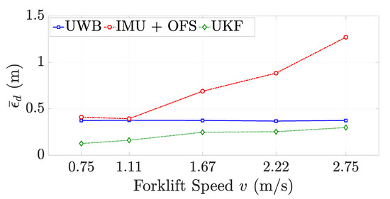 The forklift speed might impact the UKF performance. To check it, we simulated the forklift trajectory as that depicted in Figure 3, but we changed the forklift speed among the values m/s. The number of samples for each trajectory was then resized in order to keep unchanged the path length to 75 m for all trials. For each speed value, we performed 100 test cases and then we computed the mean value of , named here as . We show the results in Figure 7. The UWB performance is here unchanged due to the assumed simulation model. Instead, the mean distance error for the dead-reckoning process (circular red markers) increases with the forklift speed, and so, also, the mean distance error of the UKF, due to the fact that the sensor fusion approach relies on both UWB and proprioceptive sensor data. On the other hand, the UKF keeps “bounded” the increasing of the mean distance error, which is lower than the error committed by the UWB system, even when the forklift travels at 2.75 m/s. Given the fact that forklifts usually cannot travel faster than 2–3 m/s for safety reasons, we can conclude that the UKF is robust with respect to the increase of the forklift speed.