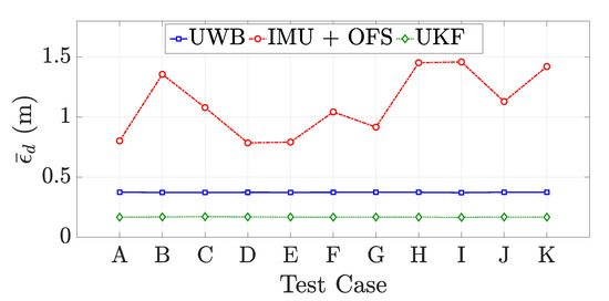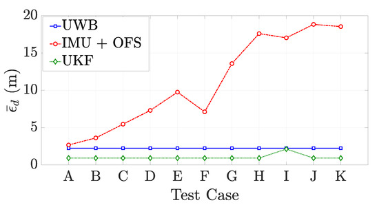 Tracking algorithms should be robust with respect to errors in the filter initialization. Positioning systems as the UWB systems are not affected by this problem. Dead-reckoning, instead, is invalidated by large initialization error. A sensor fusion algorithm based on sequential estimators such as the UKF, should converge even if an initial error on the dynamic state estimation is present. For this purpose, we performed an analysis of the method performance when the matrix changes. We considered different values of and to perform the method with 11 different configurations of the initial error standard deviation. The values of the changed parameters in each configuration are shown in Table 1. For each configuration, we ran the UKF 100 times and we observed the mean distance error .