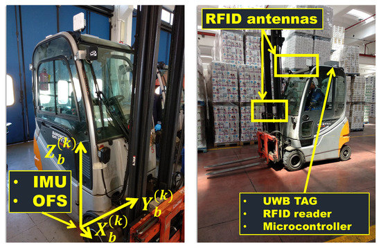Considering that the UWB anchors will be installed at the room ceiling, the UWB tag is instead positioned on the roof of the forklift, to ensure its visibility. The smart forklift is equipped with a Decawave DWM1001 UWB module of the MDEK1001 development kit placed on the forklift roof with a displacement of m, with respect to the box containing the IMU and the OFS. Due to forklift structure reasons, it was not possible to place the UWB tag directly above the IMU and OFS, so it also necessary to foresee that the 2D position measured by the UWB system does not correspond to that of the other two sensors. All onboard sensors are properly time-synchronized together through the RENESAS SK-S7G2 microcontroller, which sets the sampling time at ms.