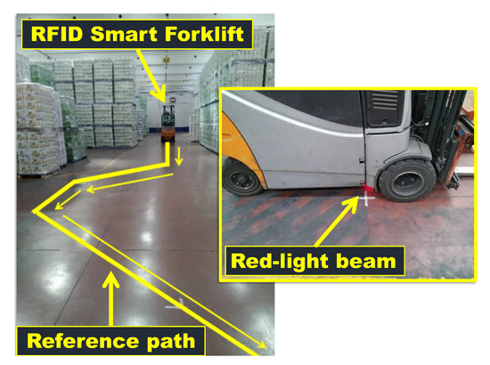 Figure 11 shows a photo of a part of the reference path indicated by the adhesive tape stuck on the ground. To make sure that the forklift was following the reference path accurately, the OFS mounted on the forklift was used. In fact, this sensor projects on the ground a red-light beam footprint, which can be used to check if the reference points marked with the tape are correctly crossed during the forklift motion.