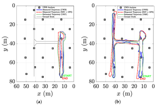 The performance of the proposed UKF algorithm are here demonstrated through a numerical analysis. We consider an indoor environment, where UWB anchors are deployed according to a regular grid in a 40 m × 25 m area at the ceiling and at a height m. The spacing along the x-coordinate of each anchor is 6.6 m, whereas along the y-coordinate is 6.25 m. The forklift is here considered as a single point with all of the sensor payloads (IMU, OFS, and UWB tag) placed at the same point. Therefore, m. The height of the UWB tag is 2 m, so m. The sampling time is set to 10 ms. At each timestep k, the algorithm exploits the measured distance between the UWB tag and the four closest UWB anchors to perform the multilateration. At the same time, the IMU and the OFS generate acceleration, angular speed, and velocity data. In accordance to the data sheet of the sensors that will be used for the experimental analysis, we set mm/s2, mrad/s, cm, m, and rad. The forklift starts a “square wave-shaped” path from location m with an orientation rad, and travels with a speed of 0.75 m/s until the location m after algorithm steps. The path-length is approximately 75 m. The UKF filter is run with , , and .