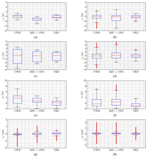 To better highlight the tracking performance improvement given by the employment of the proposed UKF algorithm in this two test cases, Figure 13 shows the boxplot of the errors along the x-coordinate (Figure 13a for test case IV and Figure 13b for test case IX), the y-coordinate (Figure 13c for test case IV and Figure 13d for test case IX), the distance error (Figure 13e for test case IV and Figure 13f for test case IX), and the orientation error (Figure 13g for test case IV and Figure 13h for test case IX).